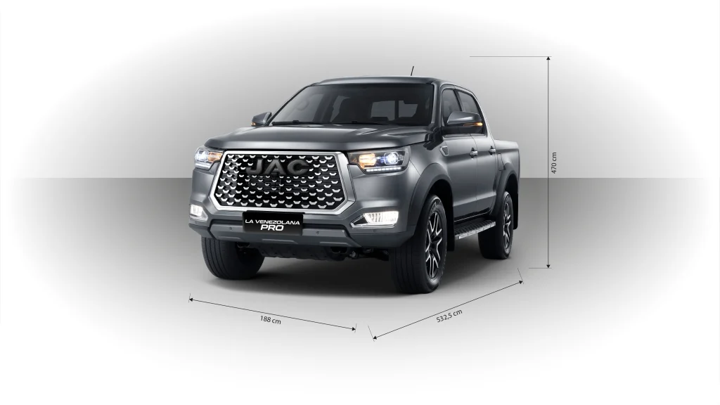 El diseño exterior de La Venezolana Pro 4×4 irradia fuerza y elegancia. Con unas dimensiones de 5.330 mm de largo, 1.965 mm de ancho y 1.920 mm de alto, esta camioneta tiene una presencia notable en cualquier entorno. La distancia entre ejes de 3.090 mm y la distancia mínima al suelo de 210 mm de La Venezolana Pro 4×4 aseguran una excelente estabilidad y capacidad para afrontar diferentes tipos de terrenos, desde caminos pavimentados hasta rutas más accidentadas.