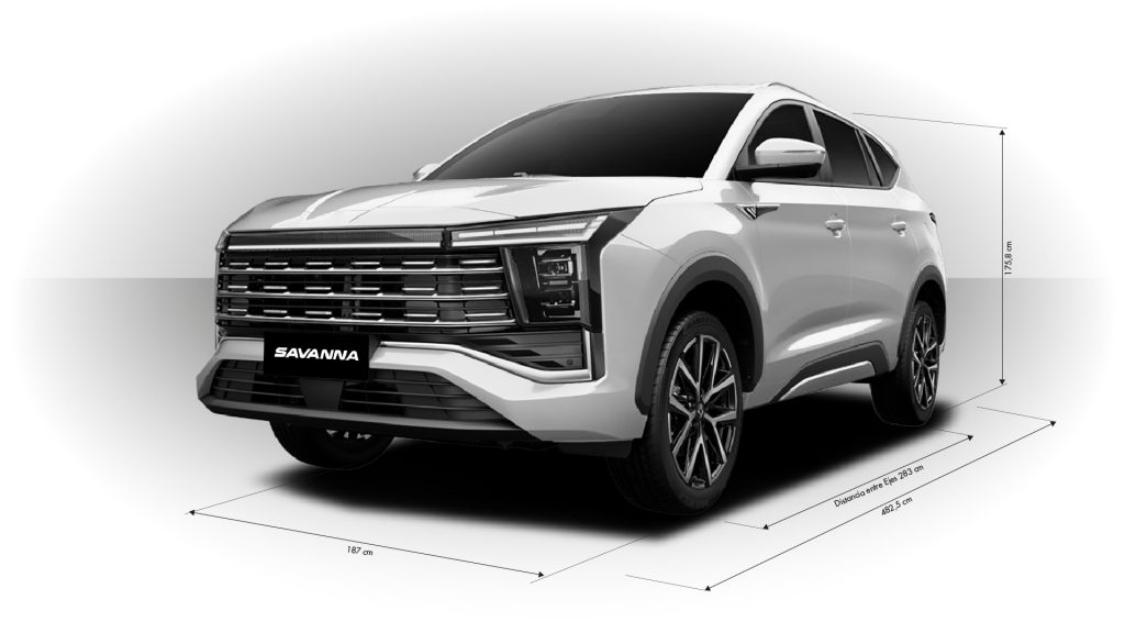 El diseño exterior del JAC Savanna destaca por su imponente presencia y líneas modernas, que transmiten elegancia y robustez. Con dimensiones de 4.825 mm de largo, 1.870 mm de ancho y 1.758 mm de alto, este SUV ofrece espacio generoso tanto para los pasajeros como para el equipaje, lo que lo convierte en una opción ideal para familias y viajeros. La distancia mínima al suelo de 160 mm y su peso de 1.675 kg le otorgan estabilidad y seguridad en cualquier tipo de terreno.